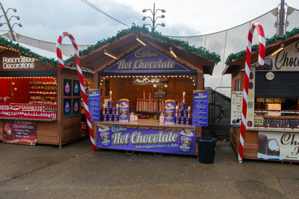 Christmas by the sea Blackpool 2025 transforms the Tower Festival Headland with a genuine Christmas market atmosphere, anchored by a collection of charming log cabins. These serve as the central hub for seasonal shopping and essential winter treats, including giant Yorkshire pudding wraps, churros, and plenty of steaming mulled wine and hot chocolate.